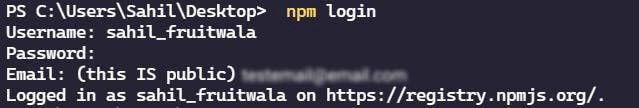 Now, to login into the npm account, use the following command. It will ask for your username, password and the email that you used to sign up.
